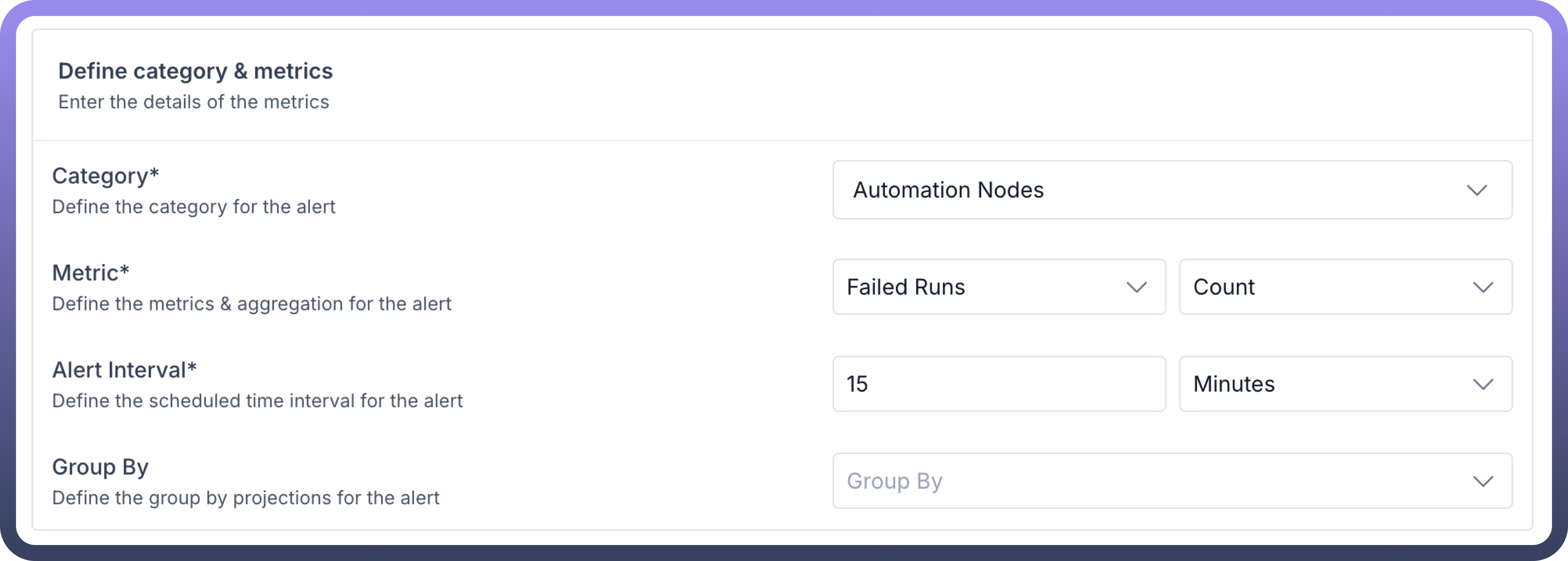 Alert Manager' inside Settings, and select '+ New Alert', and provide a name & description relevant to your alert.Configure Category & Metrics: Choose the appropriate category and metrics that align with your monitoring requirements. Also set a monitoring interval that matches the desired response time.