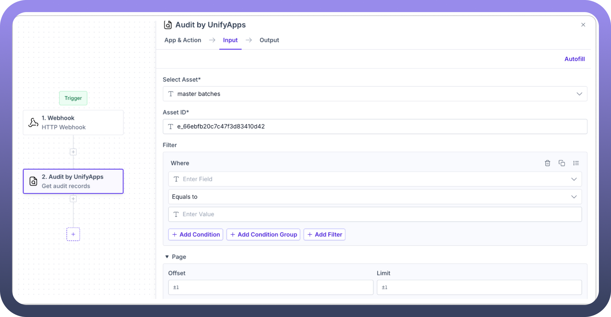Audit by UnifyAppsnode in your automation and specify the object name, asset ID, and optional filters..png&w=1080&q=75)