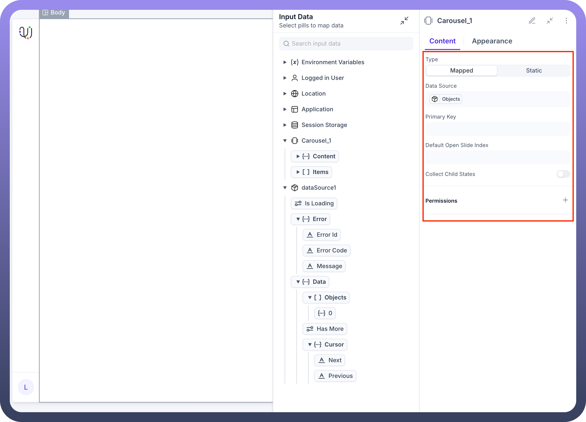 Type: Choose between Mapped (dynamic data-driven) or Static slide configurationSlides: Add, remove, and organize the sequence of carousel slidesSlide 1