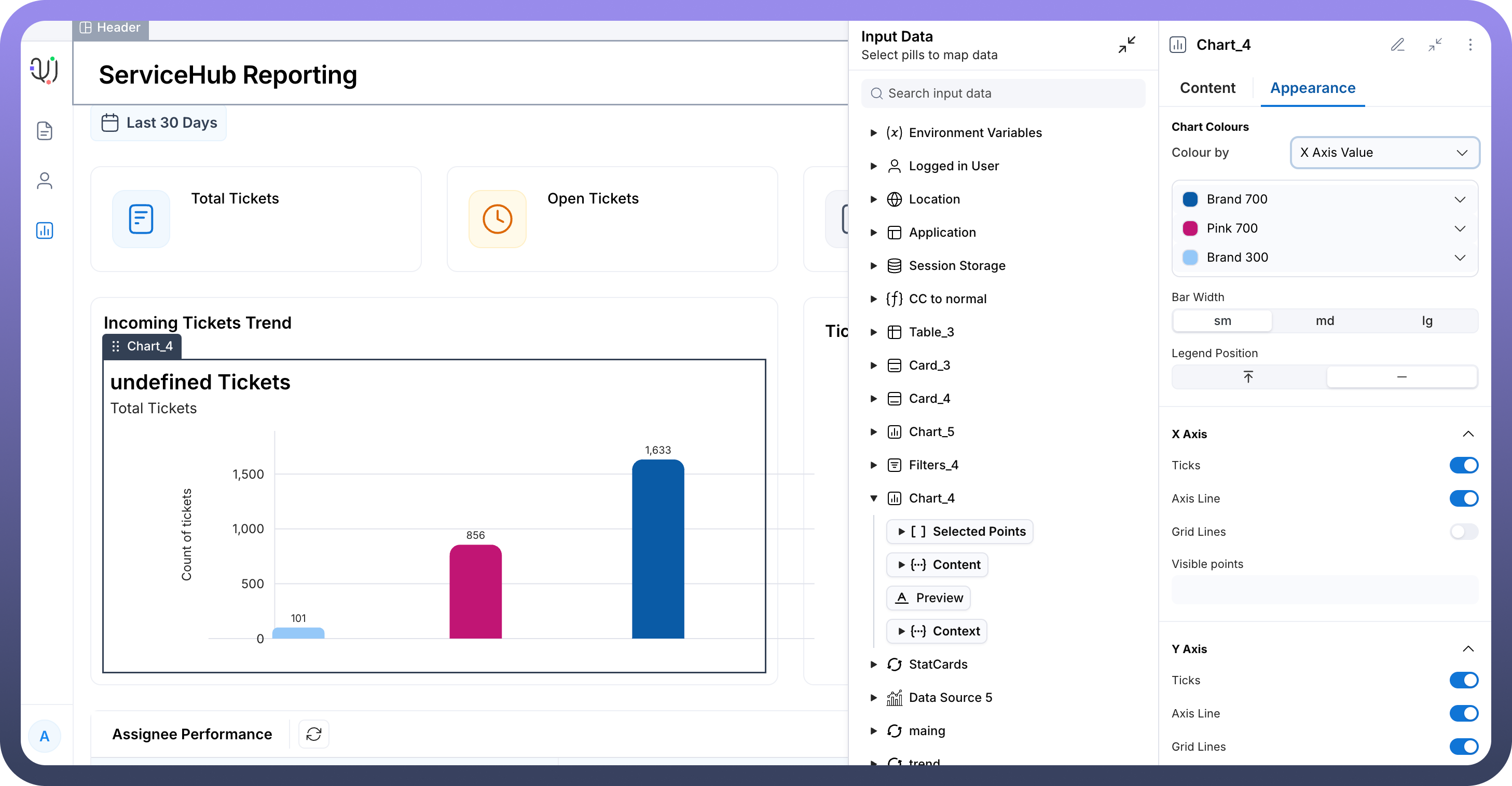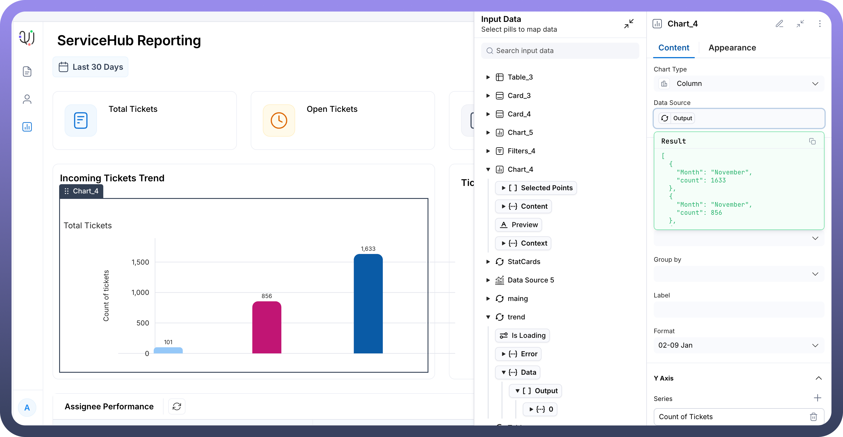 The Column Chart component is a powerful data visualization tool designed to display quantitative information through vertical bars or columns. This chart type excels at comparing values across different categories or showing trends over time periods, making it ideal for business metrics, performance tracking, and analytical reporting. Column charts are particularly effective for visualizing ticket volumes, trend analysis, and performance metrics where clear visual comparison between different time periods or categories is essential.