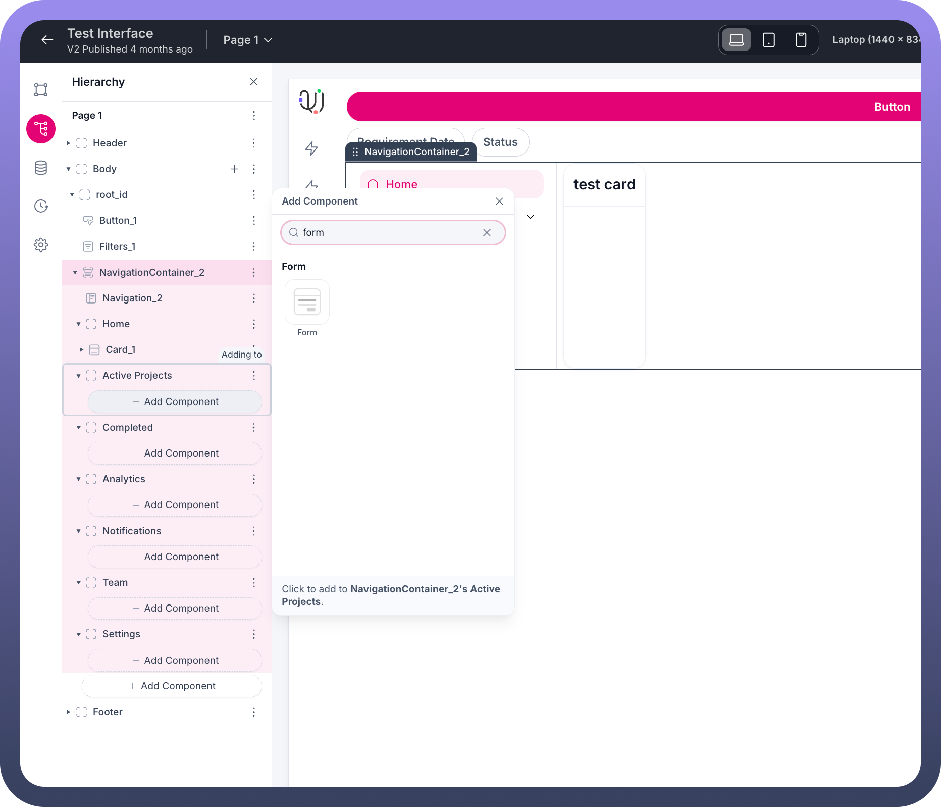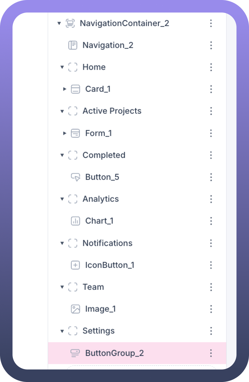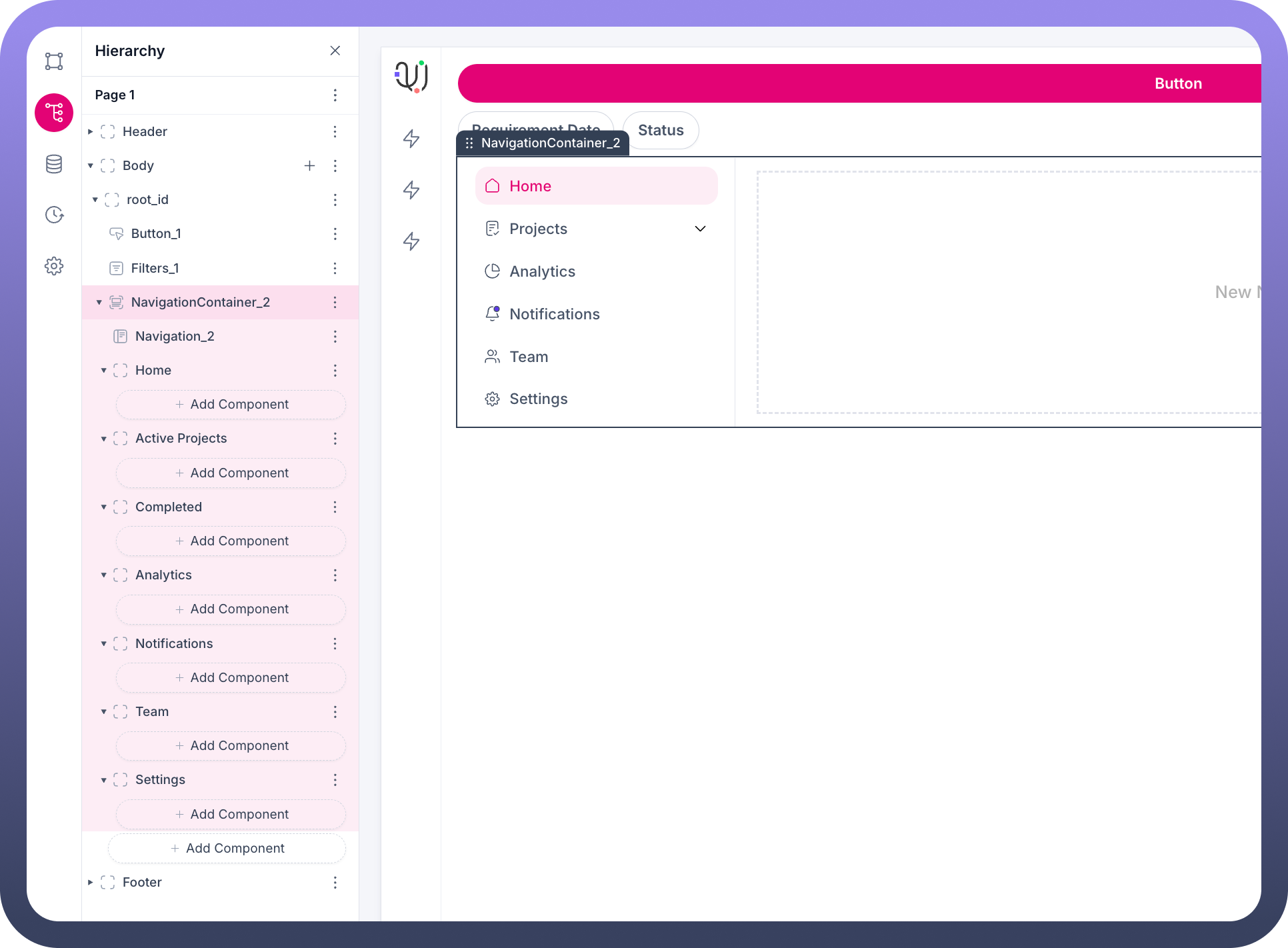 The Navigation Container component is a powerful element in your application interface that allows you to create structured navigation hierarchies with different sections and pages. This guide will walk you through how to work with Navigation Container components, add them to your interface, and customize them with various elements.