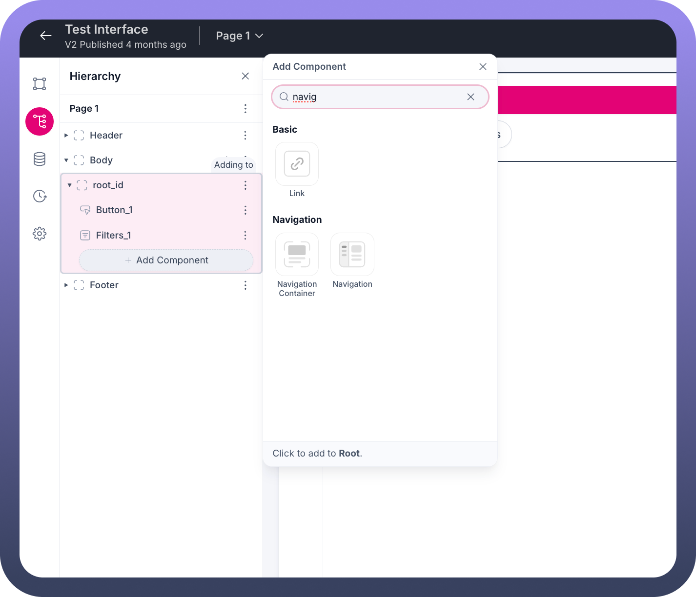 Click to add to Root" or similar, depending on your current selection in the hierarchy.Click to add the Navigation Container to your desired location in the component hierarchy.
