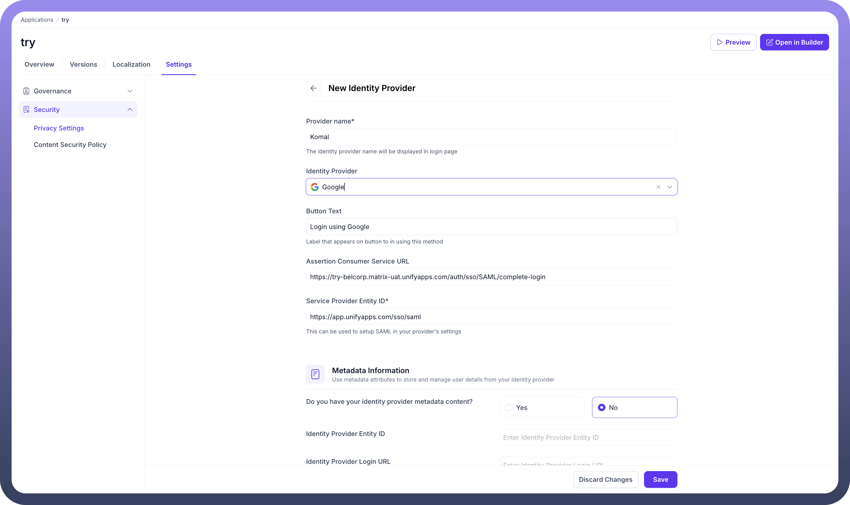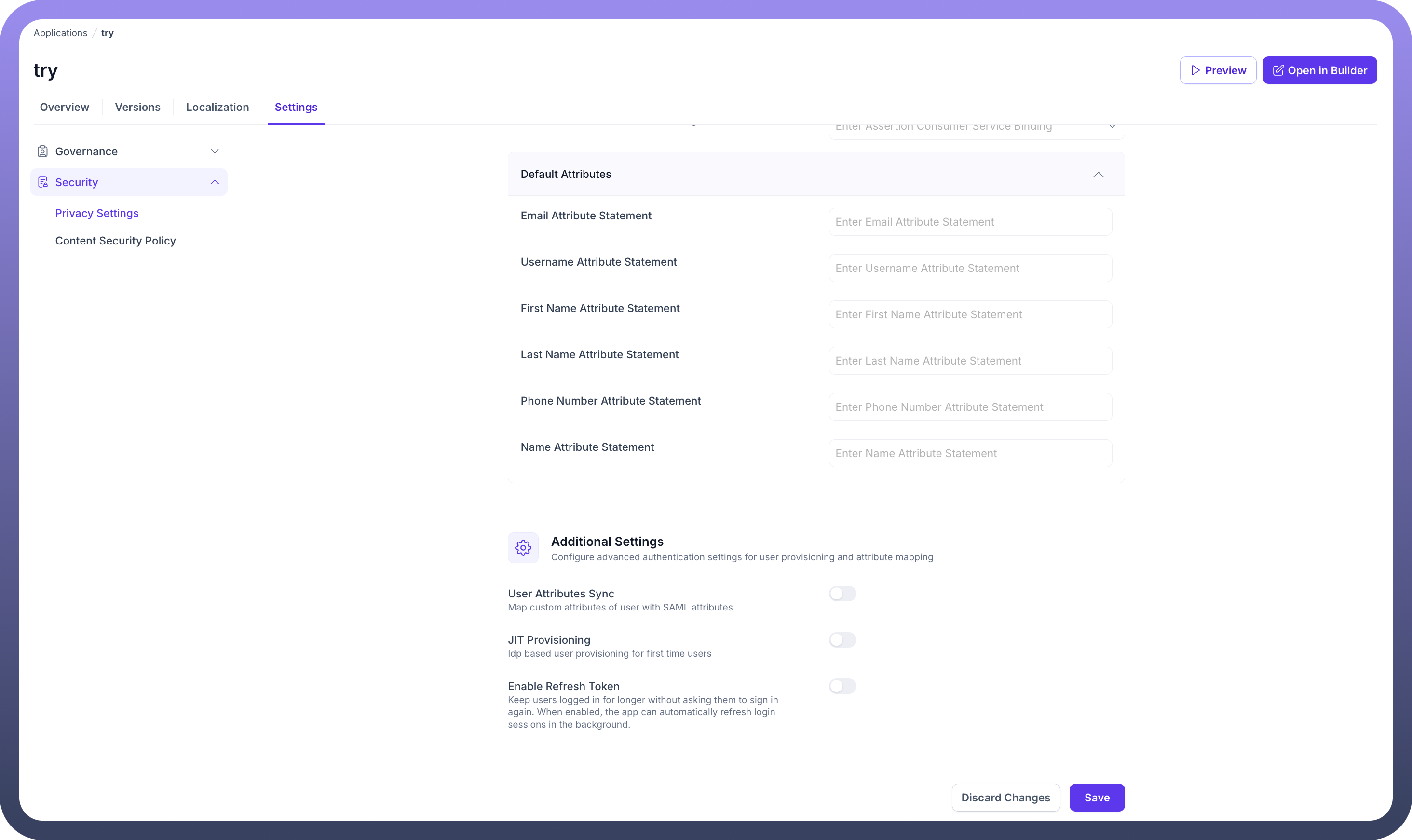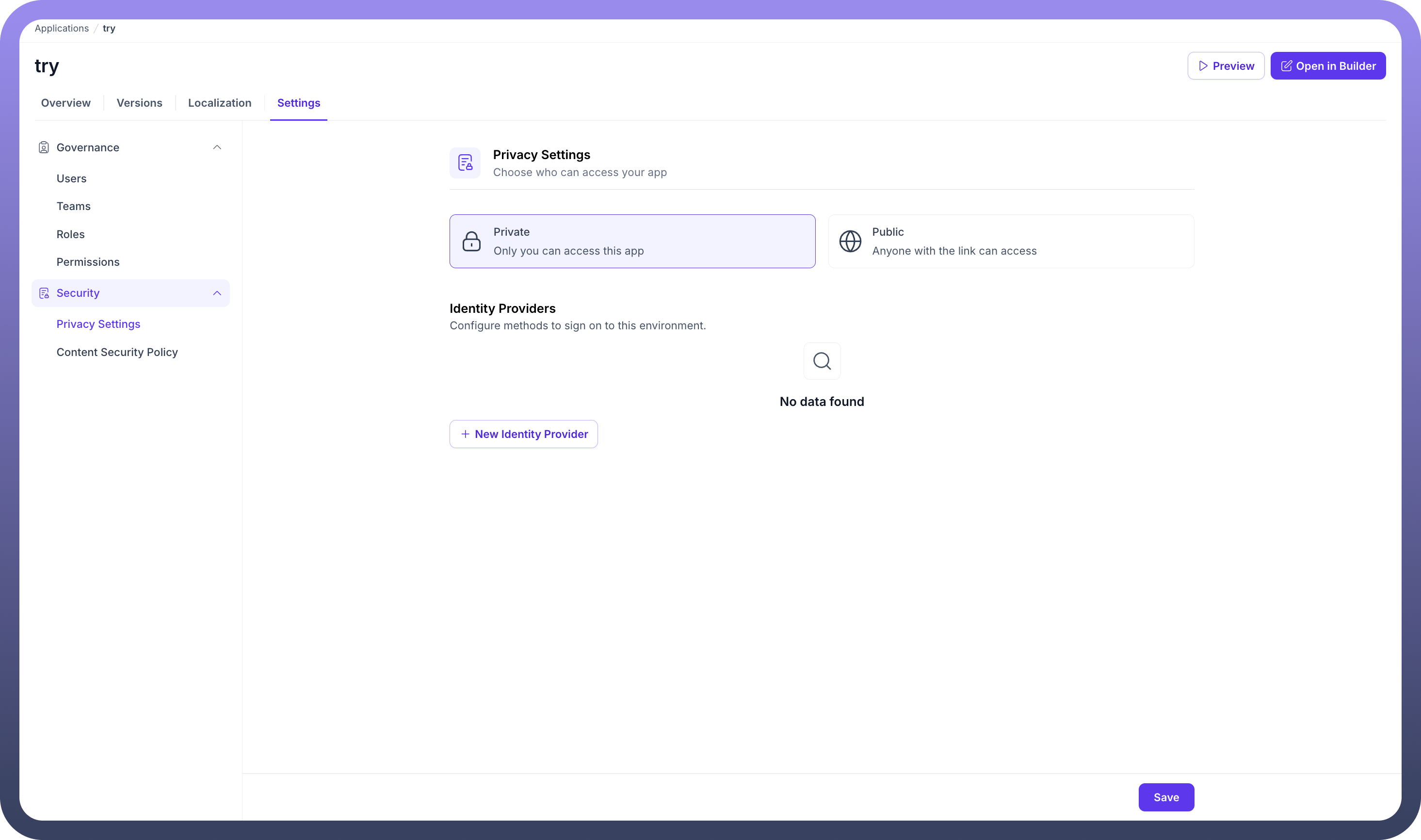 Within the Privacy Settings, you have two main areas of configuration: defining the application's access level and managing identity providers.