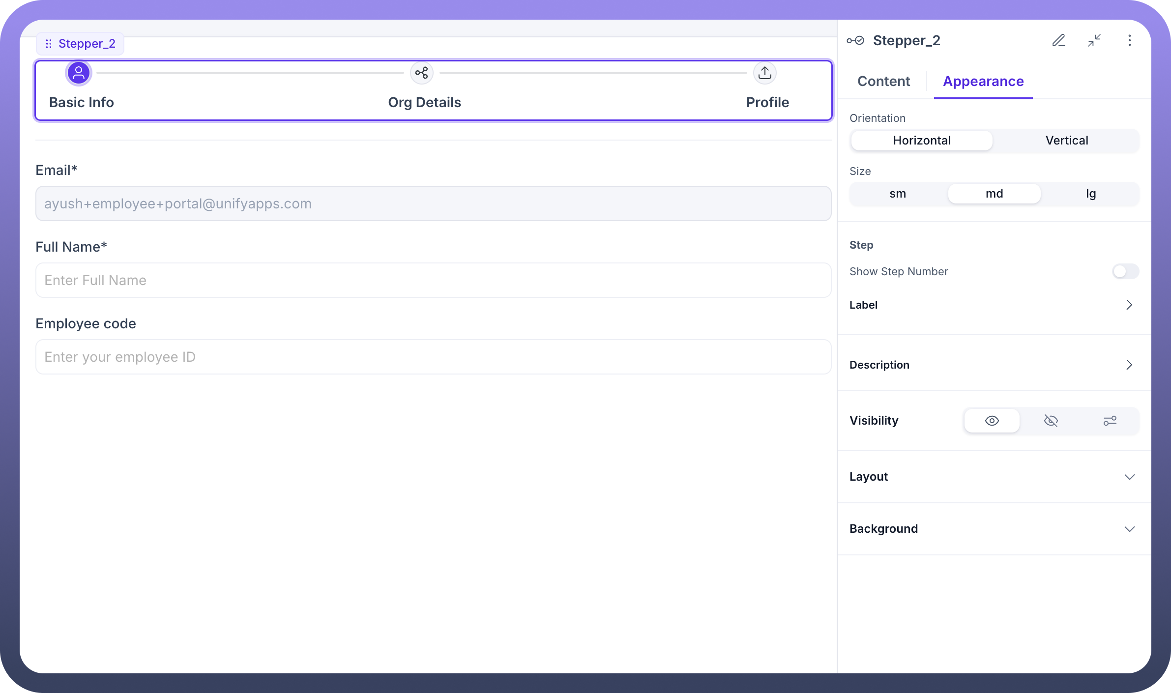Stepper by UnifyApps provides a powerful multi-step navigation component for creating guided user journeys through complex forms, workflows, and processes. This component allows you to break down lengthy forms into manageable sections, improve user experience, and guide users through sequential tasks while maintaining context throughout the process.