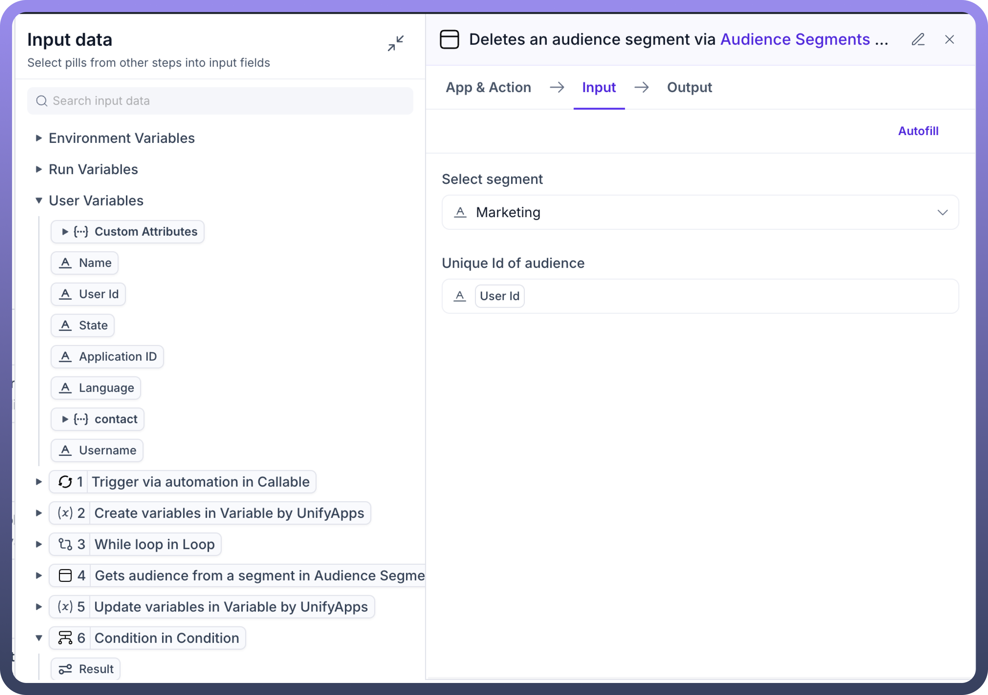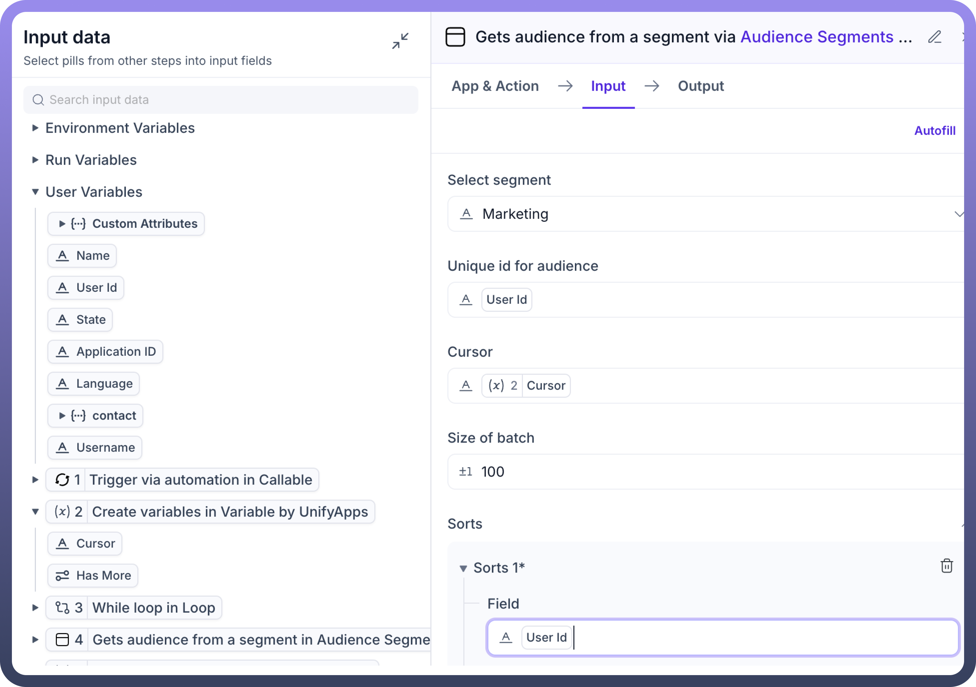 Select Segment: Select the segment from dropdown which you have already created earlier in Segment ManagerUnique id of Audience: Select the mapping for Unique Id which will be used to fetch the audience. For e.g in this example, we have mapped it to “UserId”. This will be treated as the primary field to delete the records in the segmentCursor: Cursor helps you identify the last record/point at which the iteration has stopped. For e.g. if you are fetching the records from a segment in batches of 100, the value of Cursor will change to 100Size of batch: This helps to define the batch size in which the audience will be fetched from the segment. For e.g. if someone specifies a batch of 100 , audience will be fetched in batches of 100Sort: Sorting helps you define the order in which the records from the segment will be sorted. You can choose any variable and select ASC or DESC for sorting