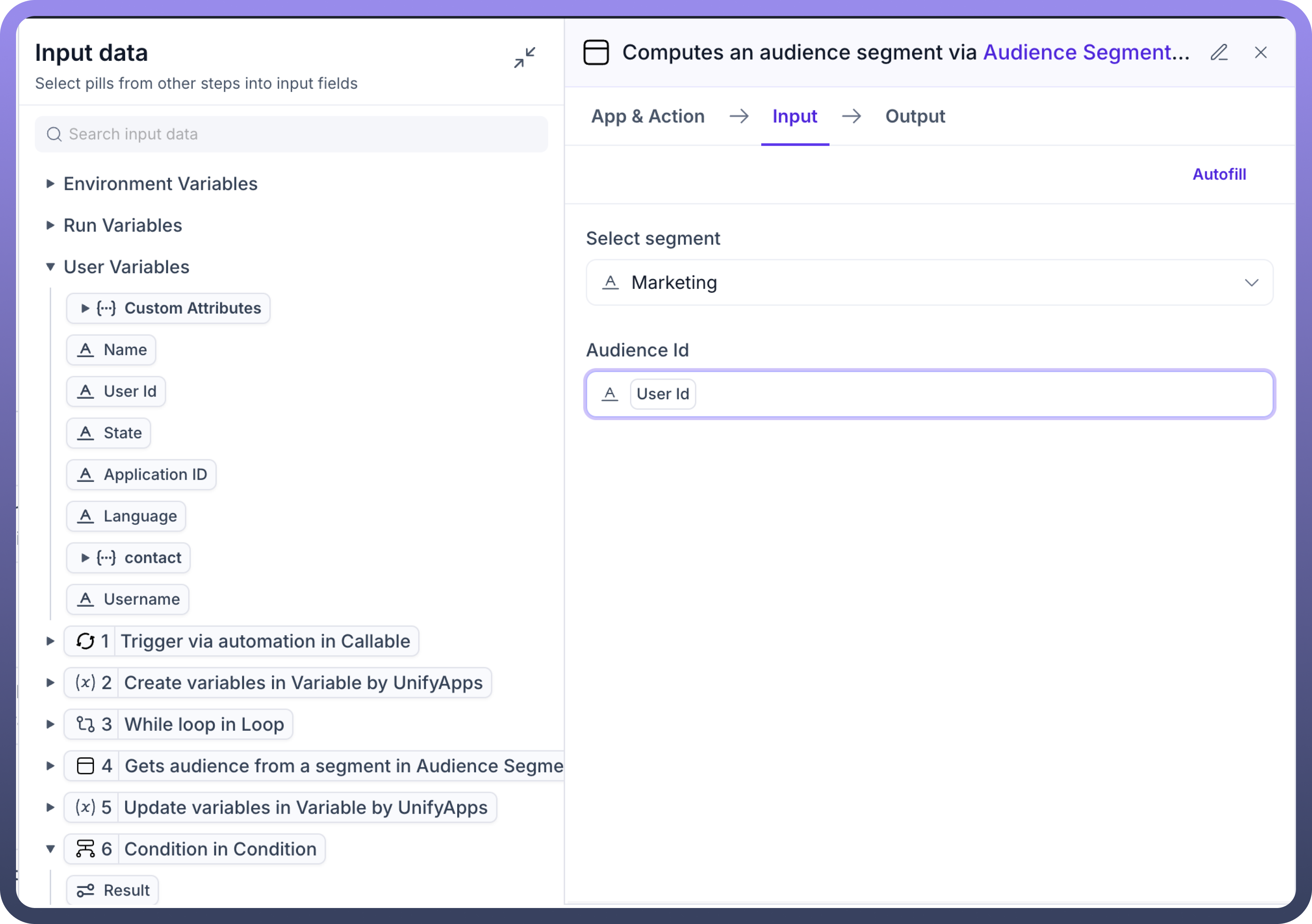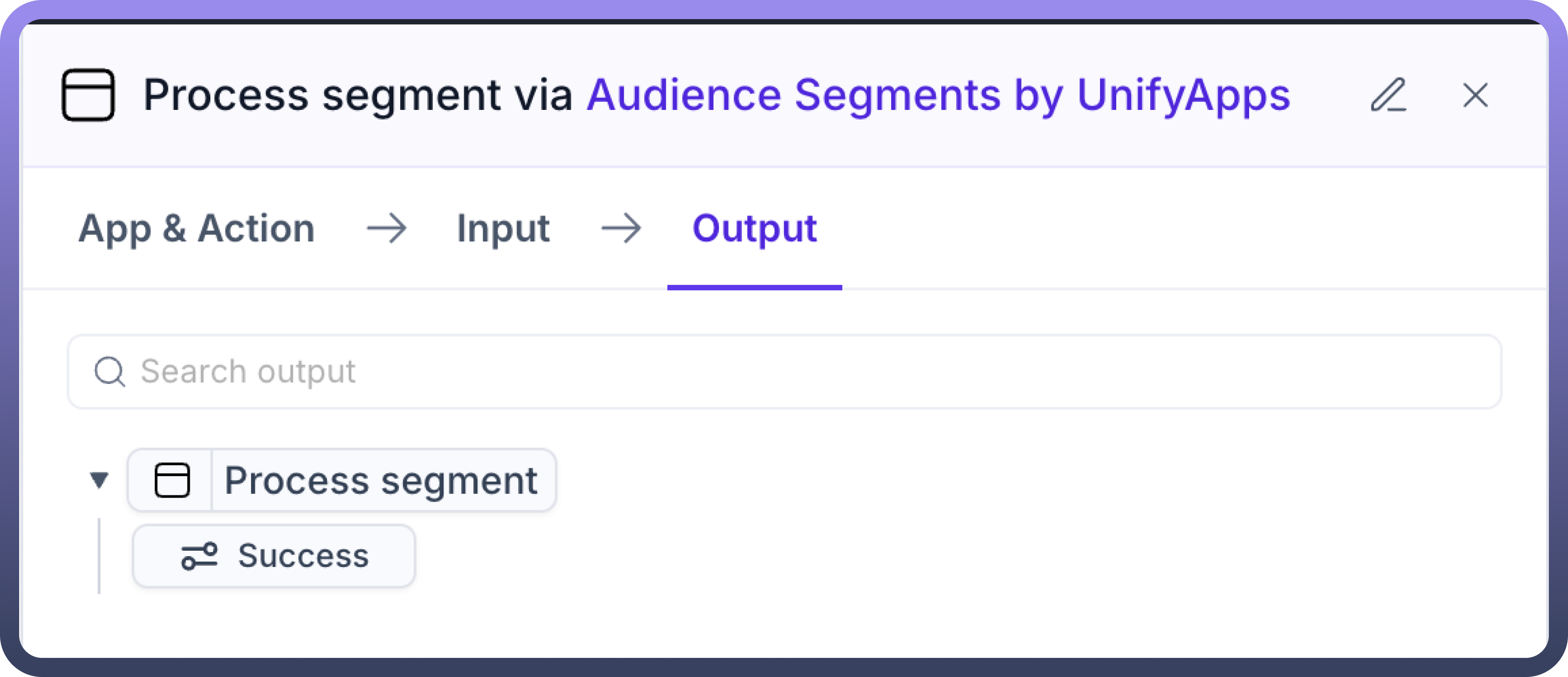 Add the Audience Segment by UnifyApps node ,select “Get audience from a segment” and provide below mentioned inputs.