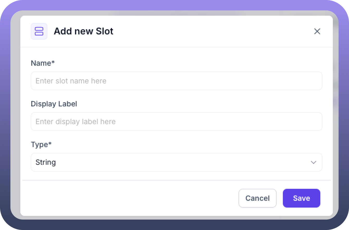 Define Slots: Add fields with name, type, and display labels.