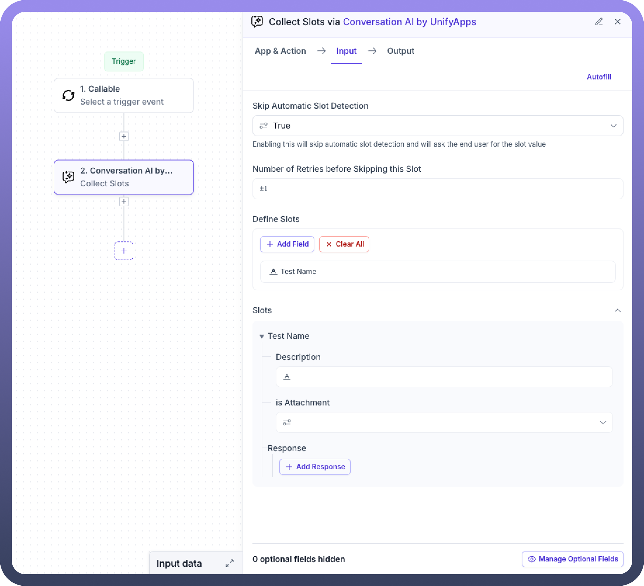 The "Collect Slots" feature streamlines structured data collection during conversations, aiding businesses in capturing essential customer information, feedback, or service requests effectively.
