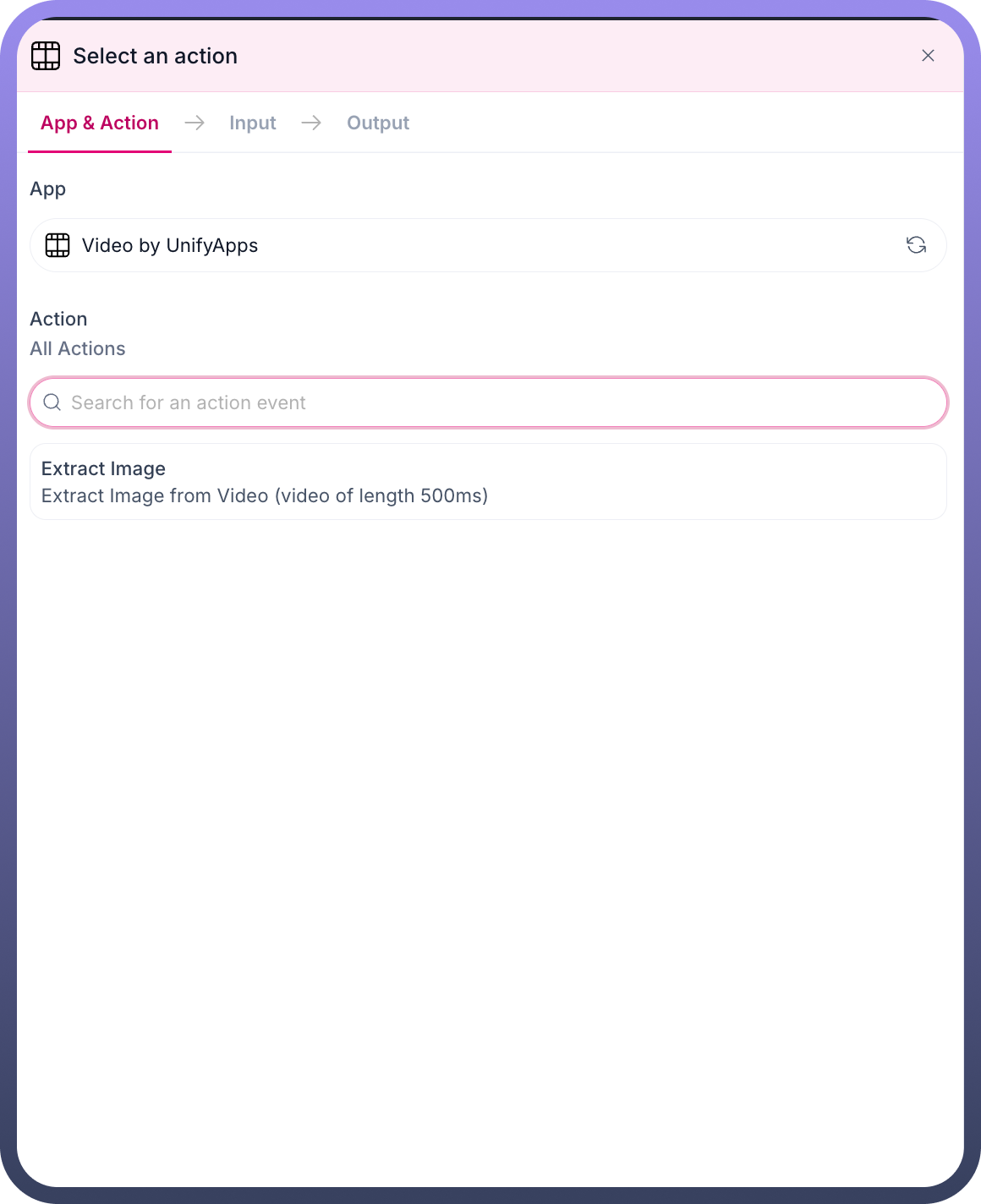 The Extract Image action in Video by UnifyApps enables precise extraction of still frames from video files. This action provides frame-level control for capturing specific moments within videos, supporting various video formats and offering flexible configuration options for different extraction scenarios.