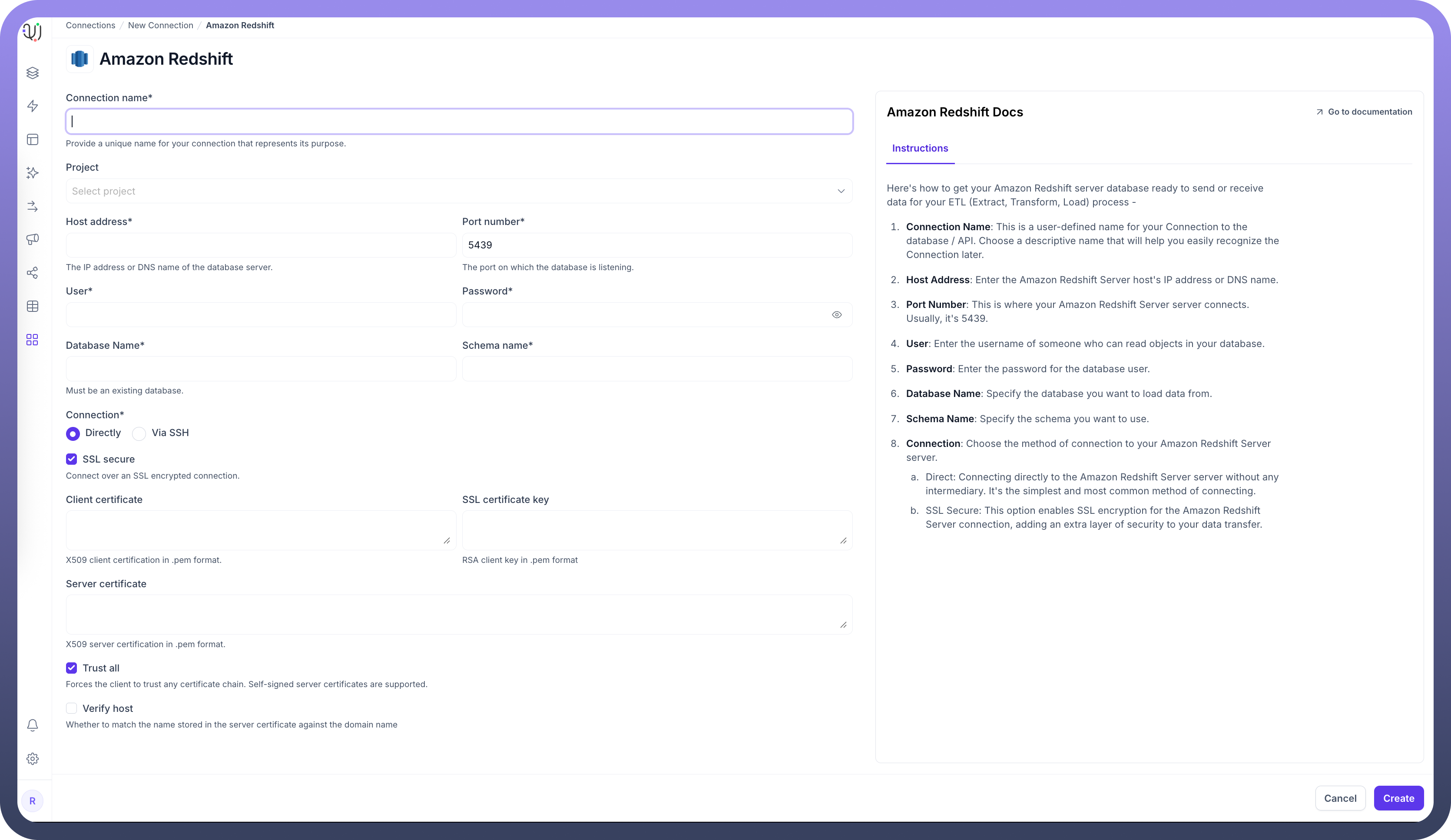 To set up a Redshift destination, navigate to the Connections section, click New Connection, and select Amazon Redshift. Fill in the parameters above based on your Redshift environment details.