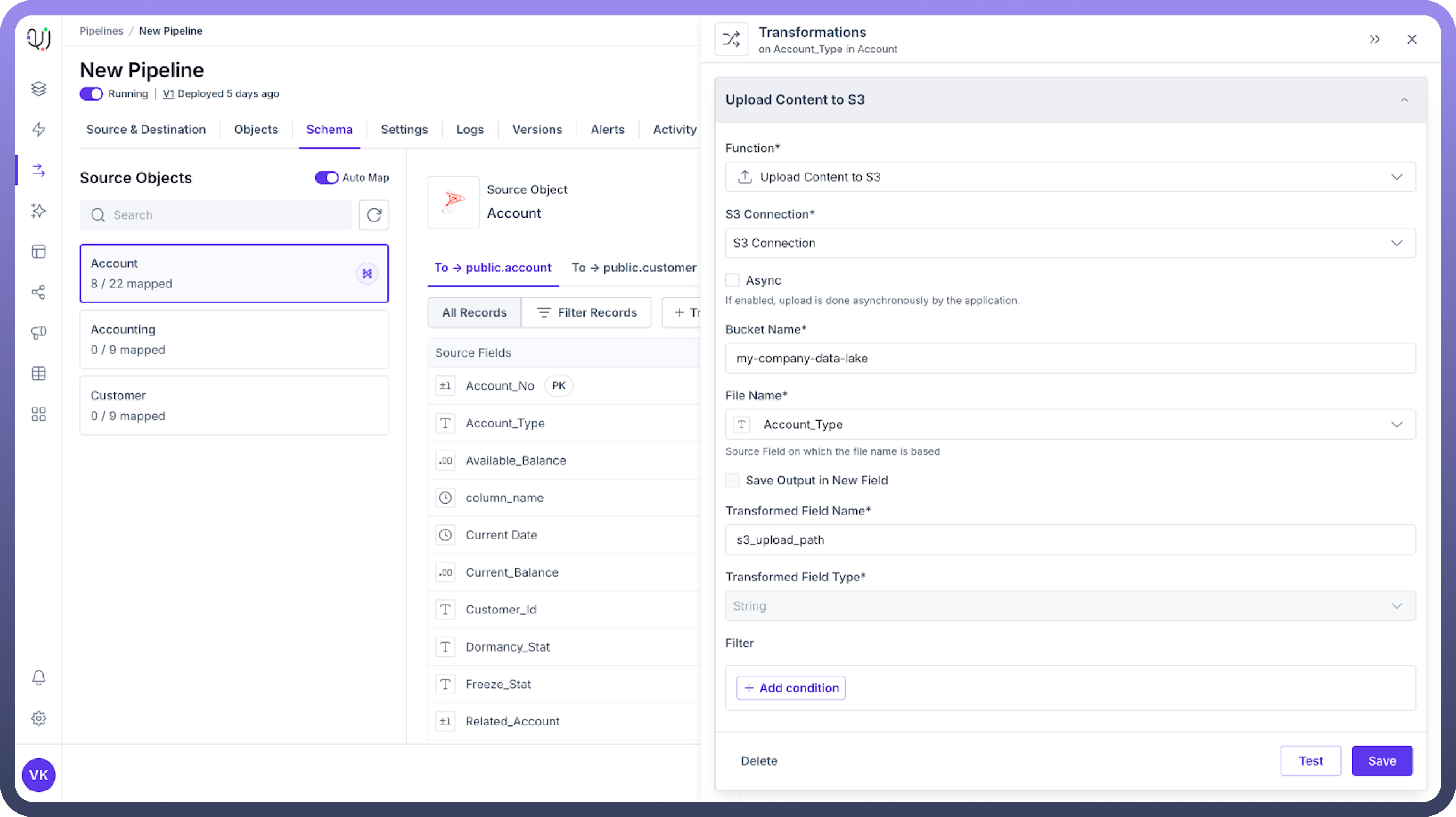The Upload Content to S3 transformation moves your data directly to Amazon S3 cloud storage from within your data pipeline. This powerful capability bridges the gap between data processing and storage, enabling seamless integration with the AWS ecosystem and beyond.