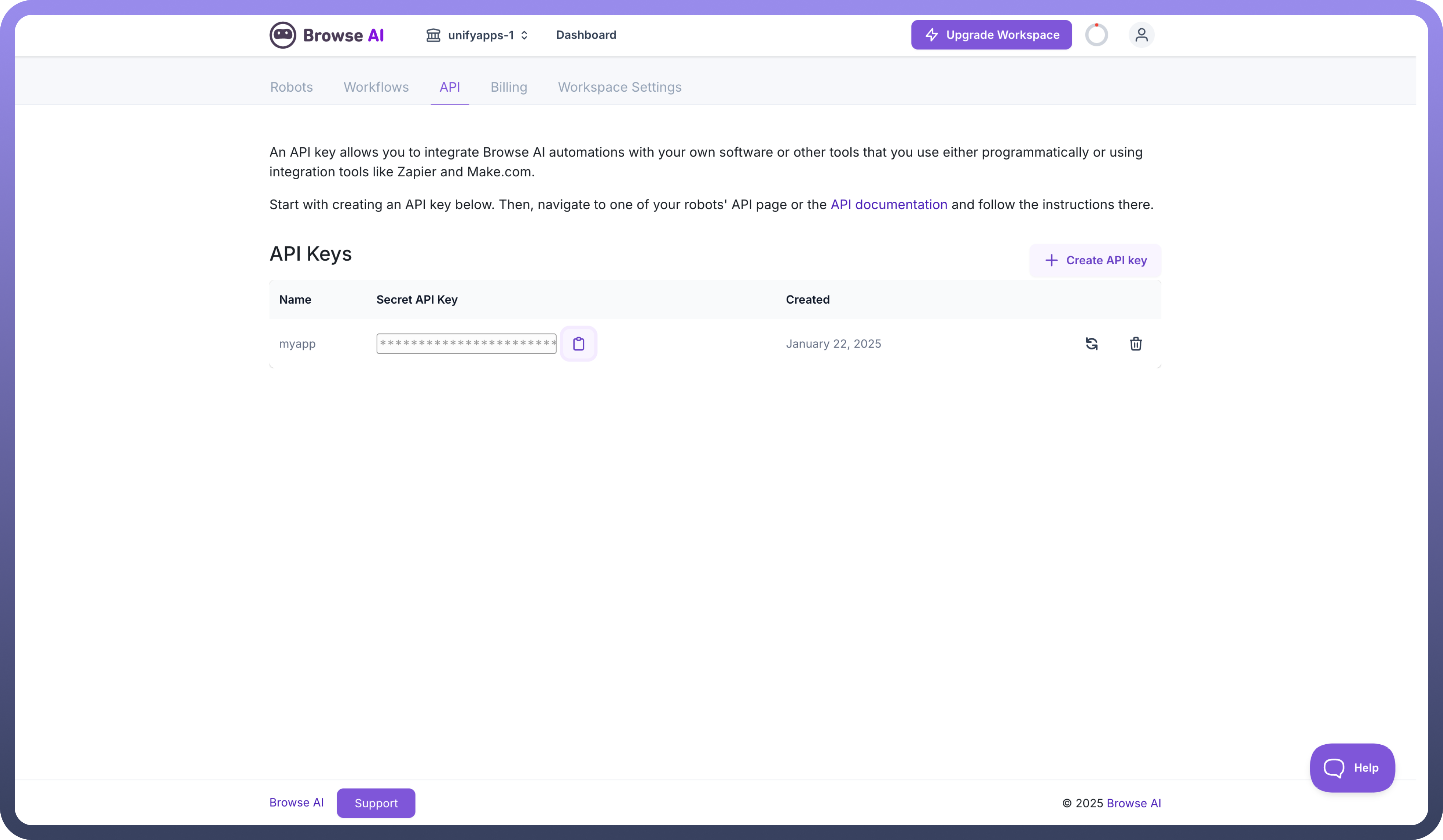create API Key" or the equivalent option to create a new API key.Store the API key securely, treating it like a password as it provides access to your Browse AI account.
