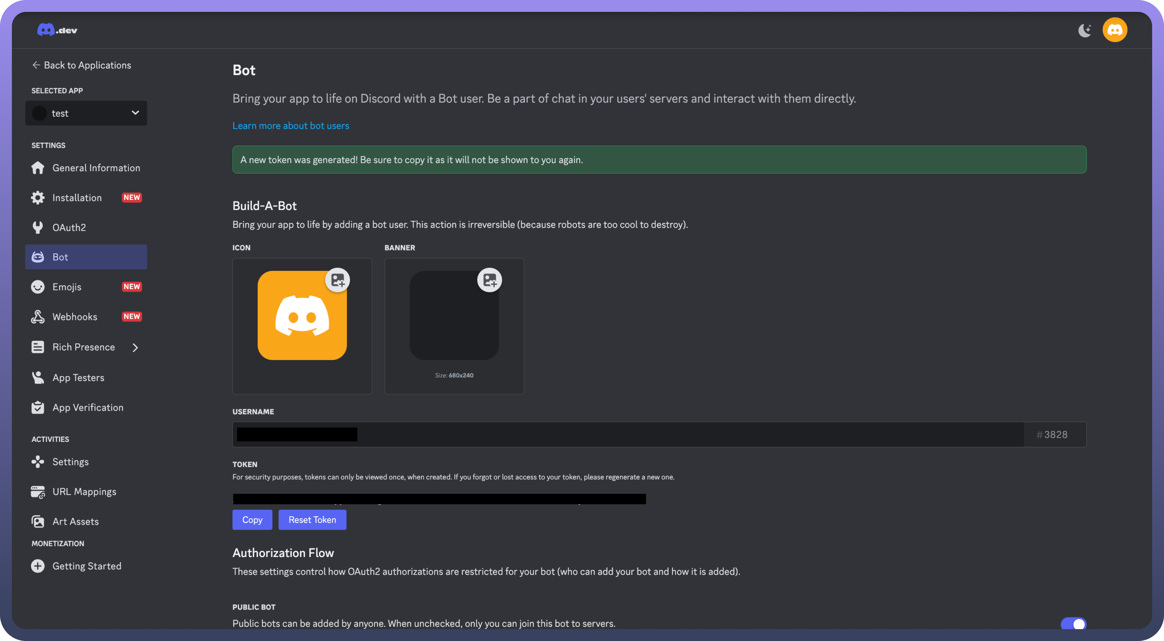 TOKEN, clickReset Tokento generate your bot token.Copy and securely store the bot token to prevent unauthorized access.
