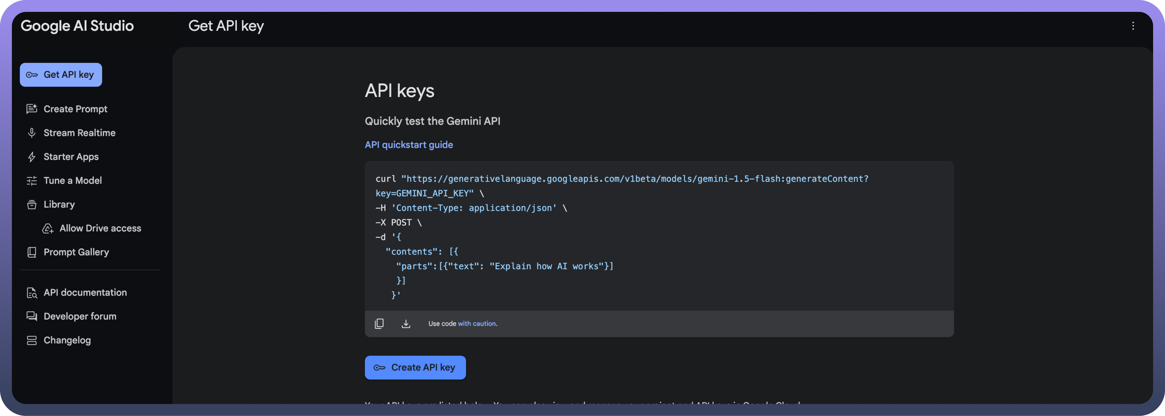 Get API key in Google AI Studio” button on the Gemini API page.Review and accept the Google APIs Terms of Service and Gemini API Additional Terms of Service. Optionally, opt-in for updates and research study participation.